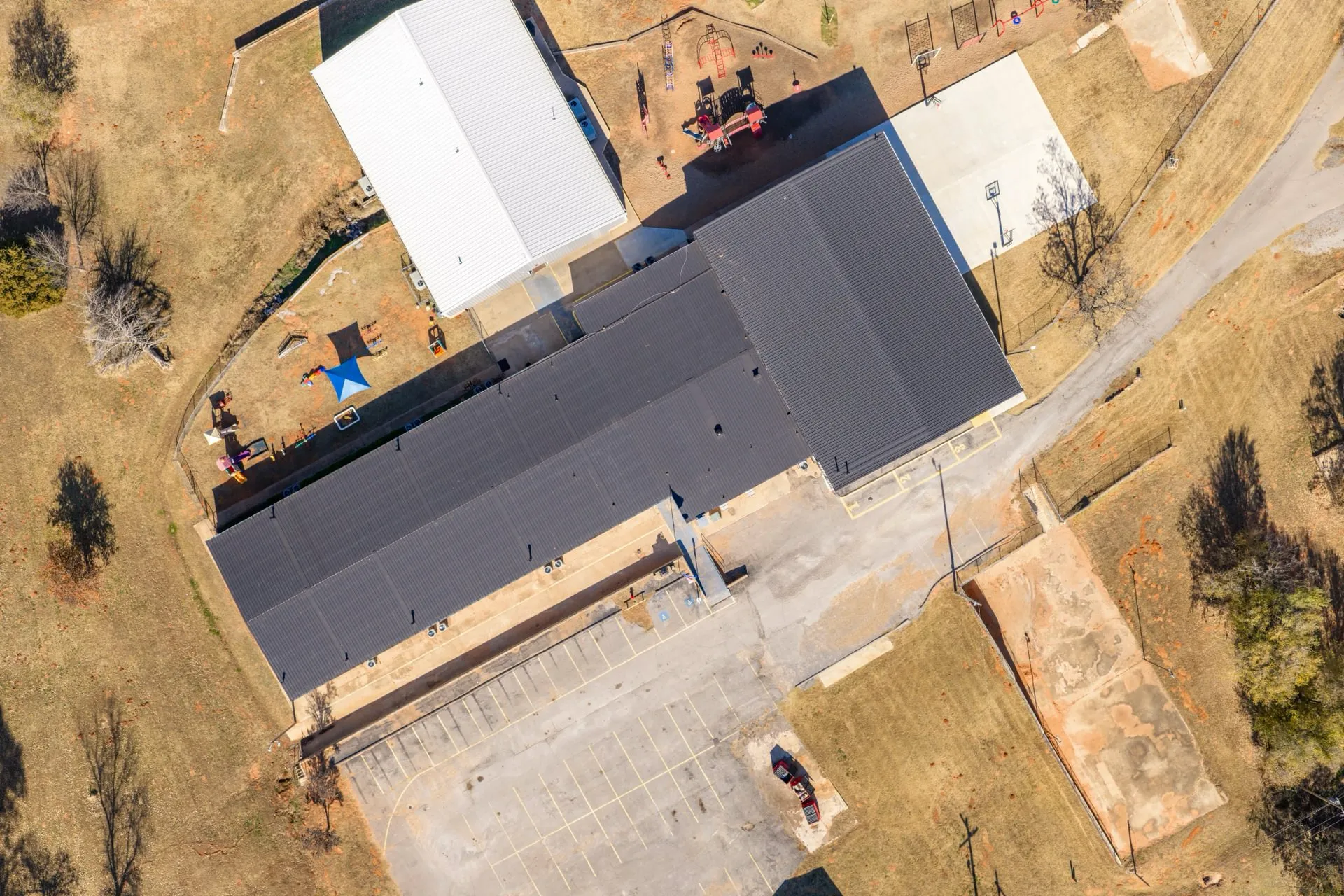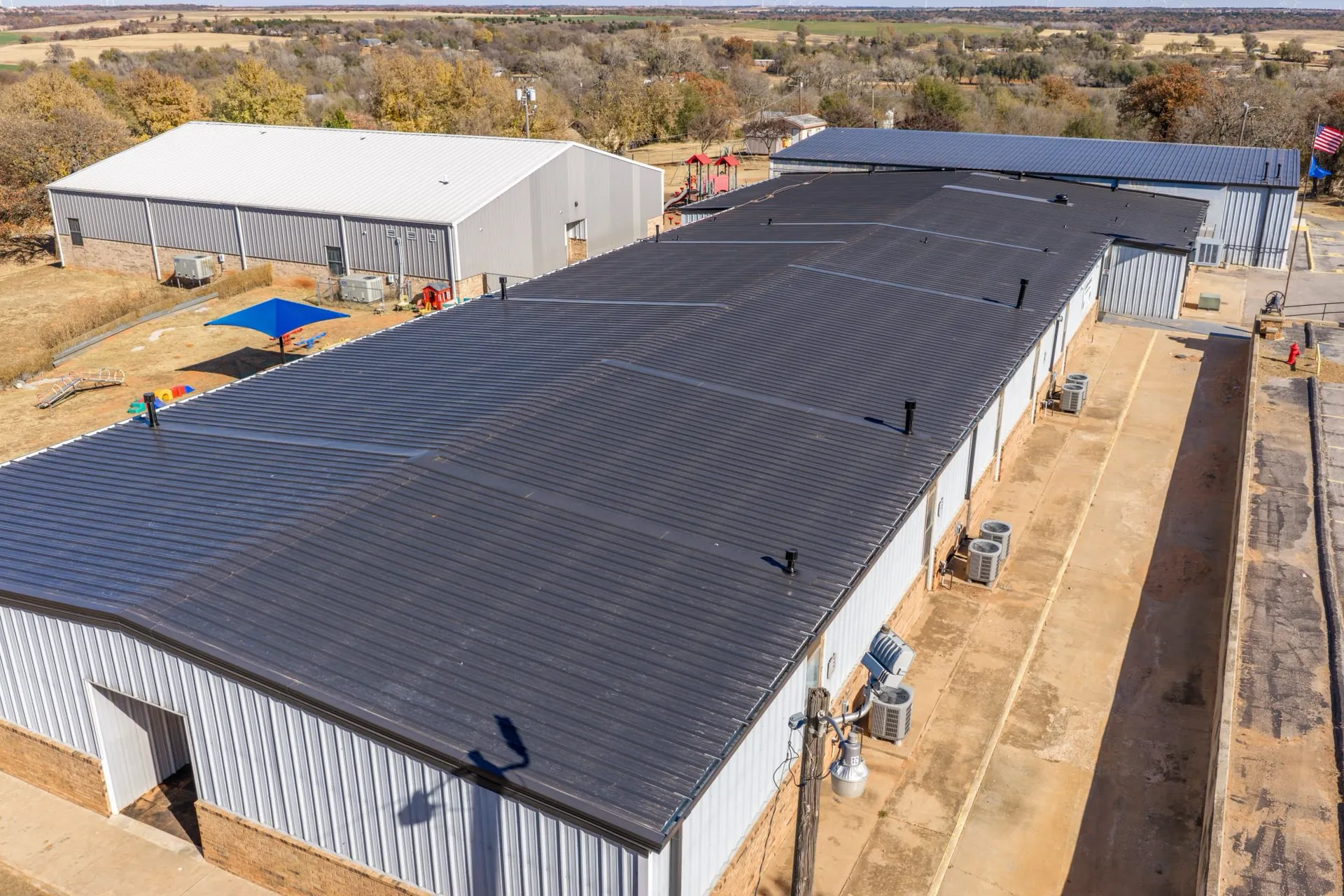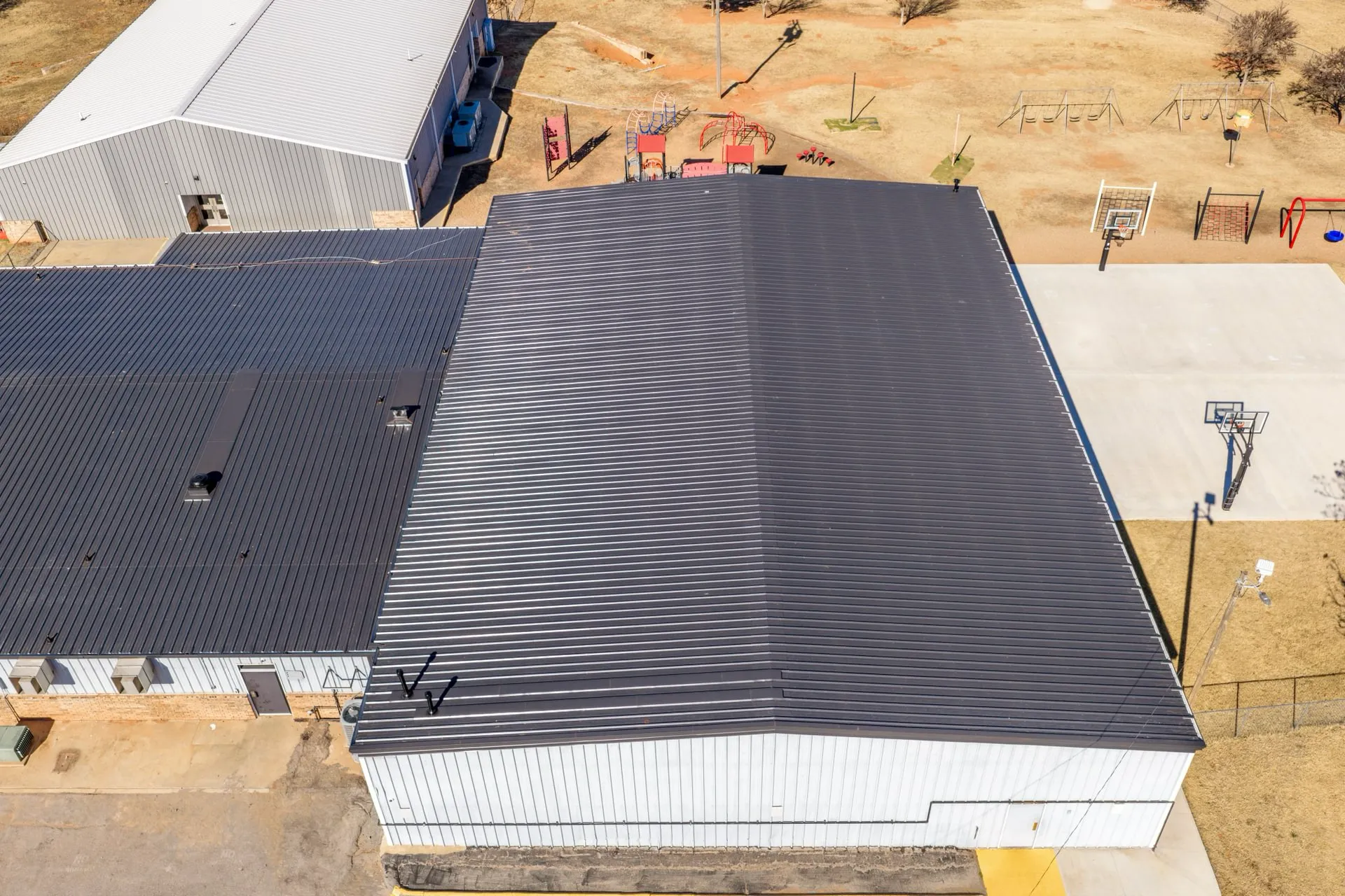 Lookeba-Sickles Public School had a failing metal roof that was causing internal leaks throughout the building. We resolved the issue by installing single-length, 24-gauge metal panels along with a new insulation system. We also designed new trim pieces for the rakes, eaves, and capped sections where large pipe penetrations previously interfered with the panel seams, creating a durable, long-term solution.