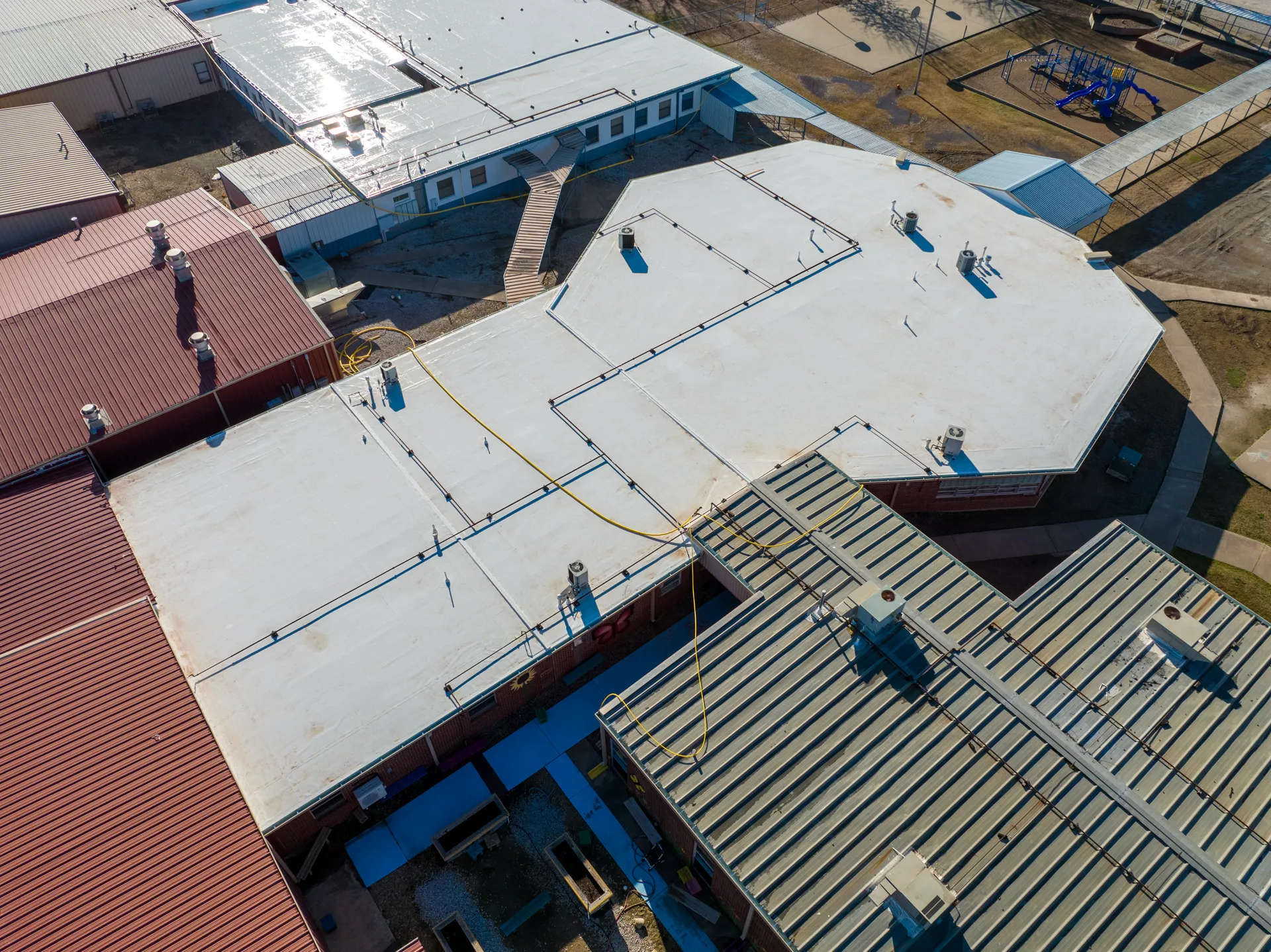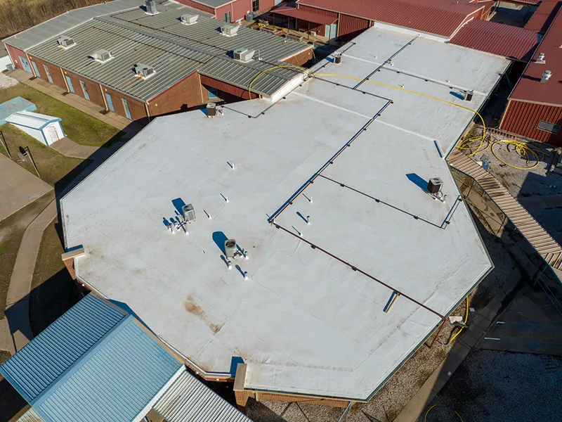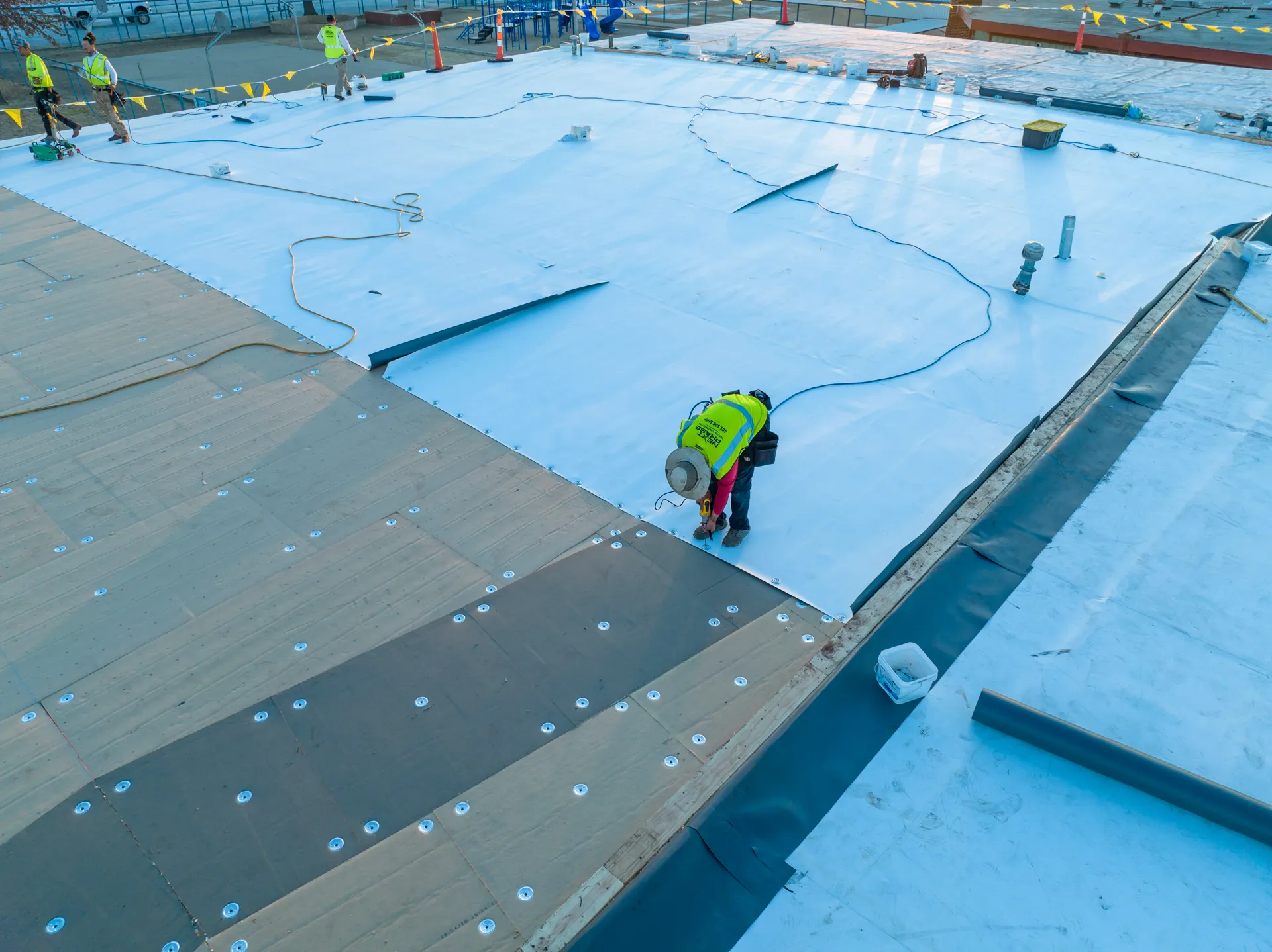 This project was a full re-roof of the flat roofed areas on campus. Massive water infiltration had occurred on the prior roofing system leading to much of the steel deck needing to be replaced. Next Phase determined that the old roof had a flat deck with no pitch. A tapered roofing system was designed that efficiently moves water off the roof and to the newly designed guttering. This roof went from no insulation to an R-30 above roof-deck insulation saving thousands on energy bills. This project was entirely conducted while school was in session. Next Phase coordinated with classrooms each day to move children out while the section was safely completed, and had no days or sessions of missed school.
