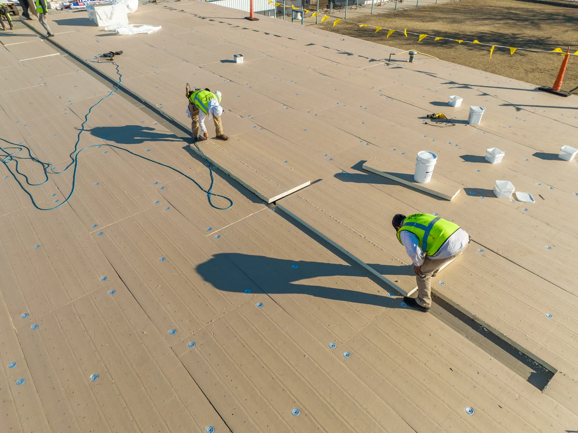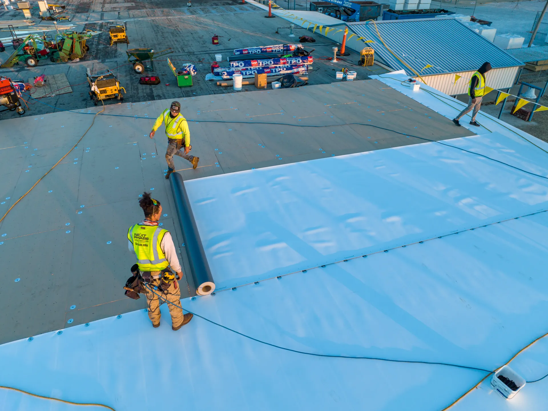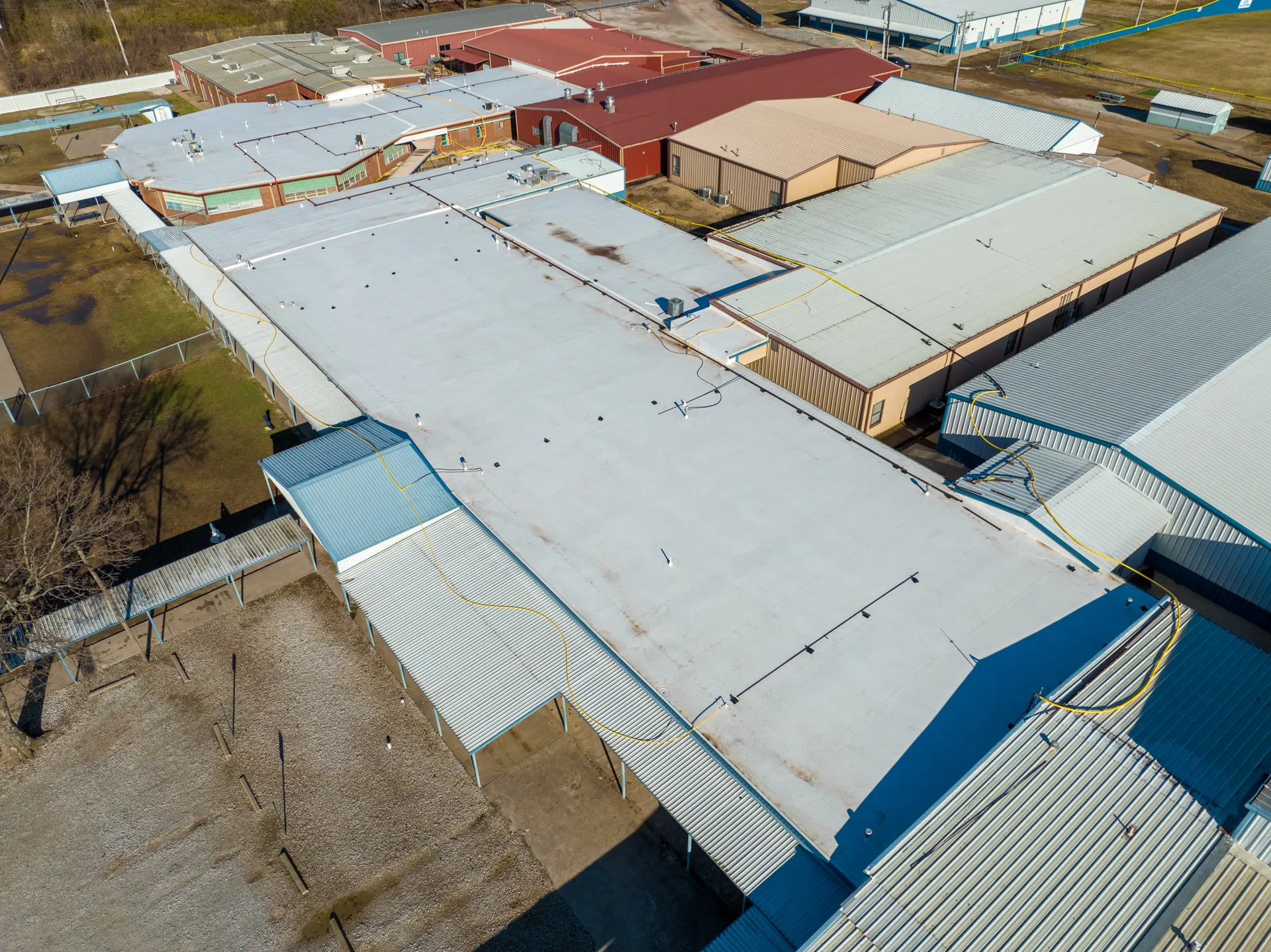 This project was a full re-roof of the flat roofed areas on campus. Massive water infiltration had occurred on the prior roofing system leading to much of the steel deck needing to be replaced. Next Phase determined that the old roof had a flat deck with no pitch. A tapered roofing system was designed that efficiently moves water off the roof and to the newly designed guttering. This roof went from no insulation to an R-30 above roof-deck insulation saving thousands on energy bills. This project was entirely conducted while school was in session. Next Phase coordinated with classrooms each day to move children out while the section was safely completed, and had no days or sessions of missed school.