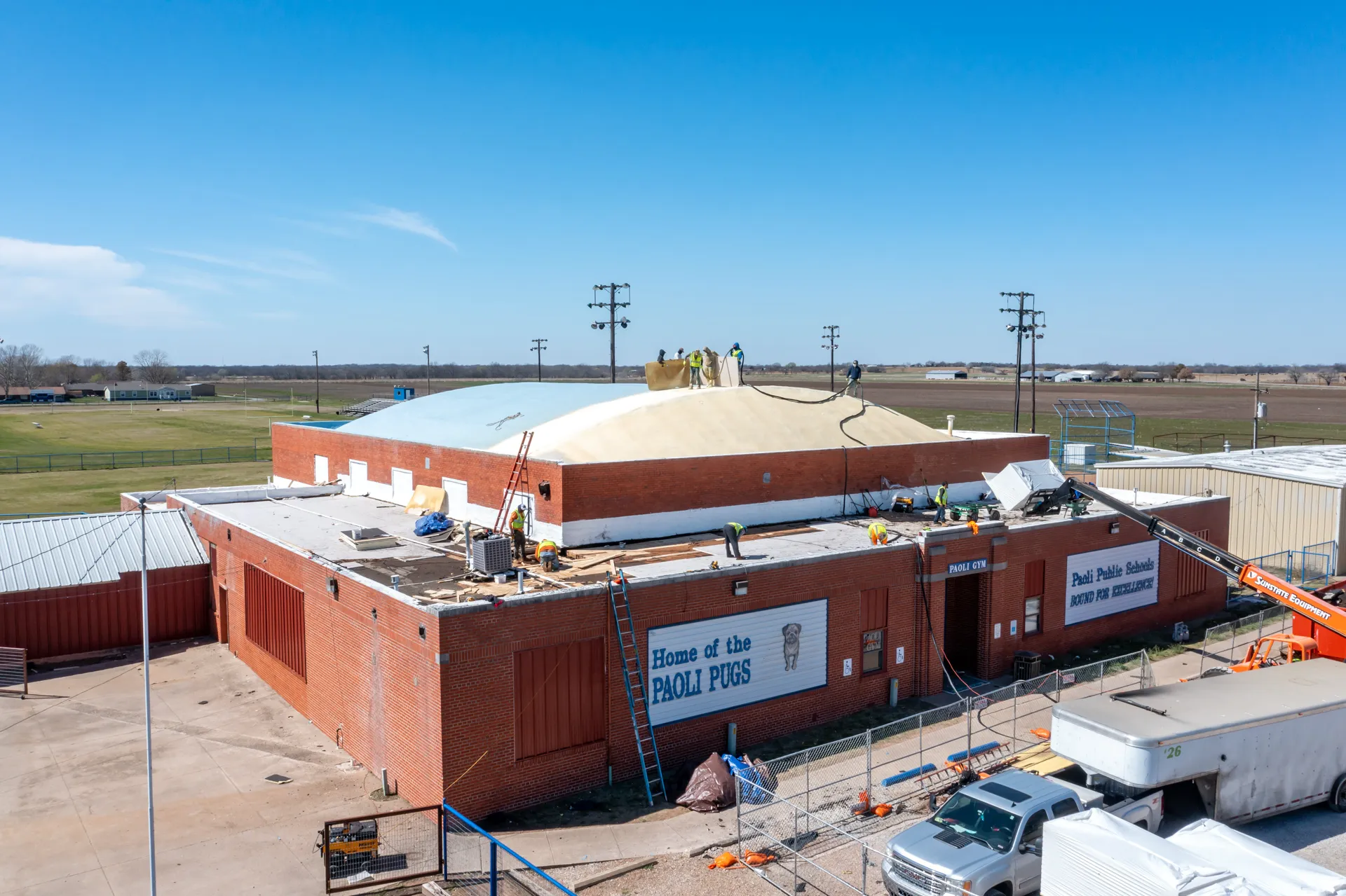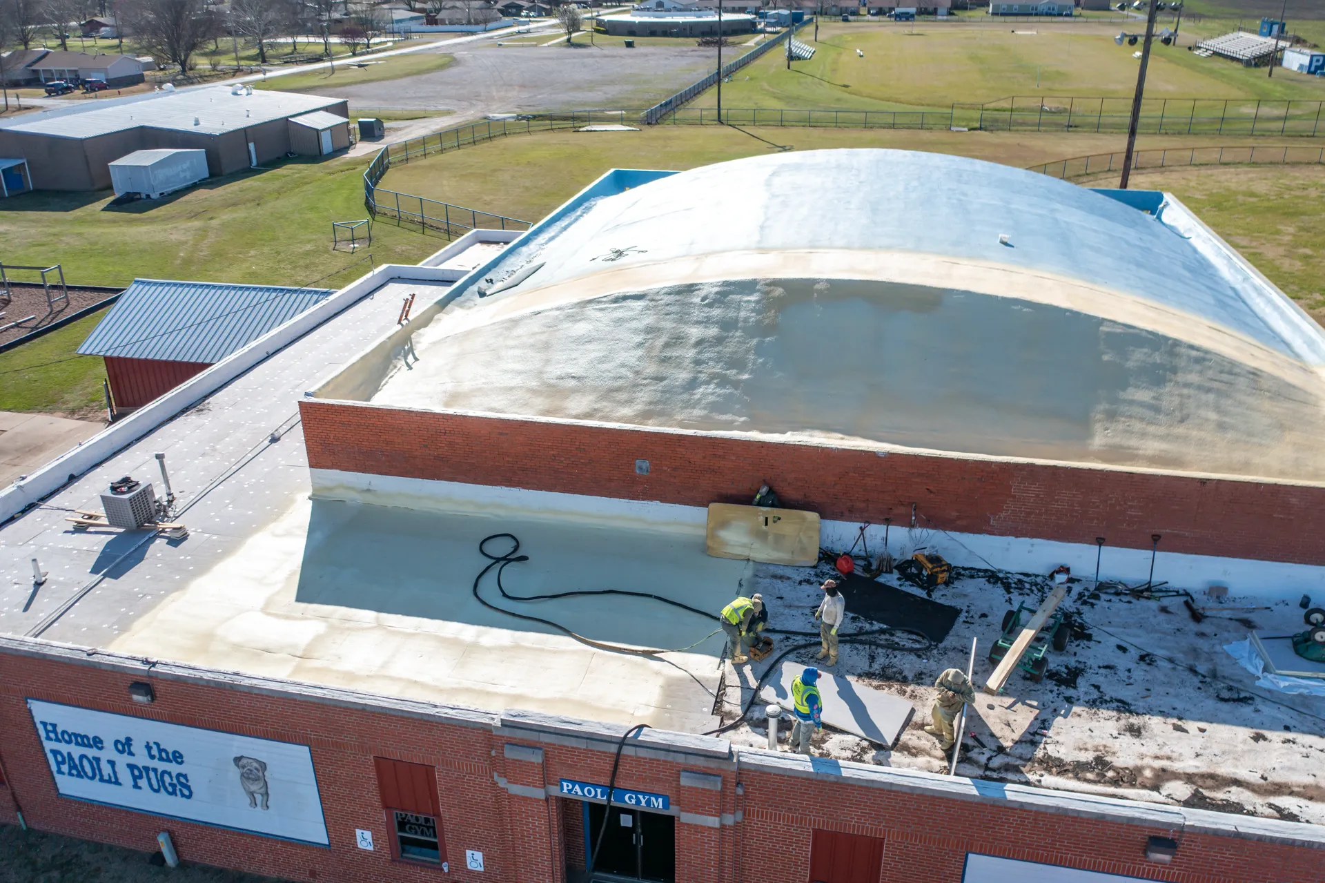 Virtually every roof type was utilized in this project. The gymnasium dome foam roof was severely damaged and was completely replaced. The high school foam roof was upgraded to a durable TPO system with special details for complex roof penetrations. The rest of the campus received replacement of all r-panel roofs. Insulation was added where necessary to increase the energy efficiency of the buildings. This project was successfully and safely completed during the active school year.