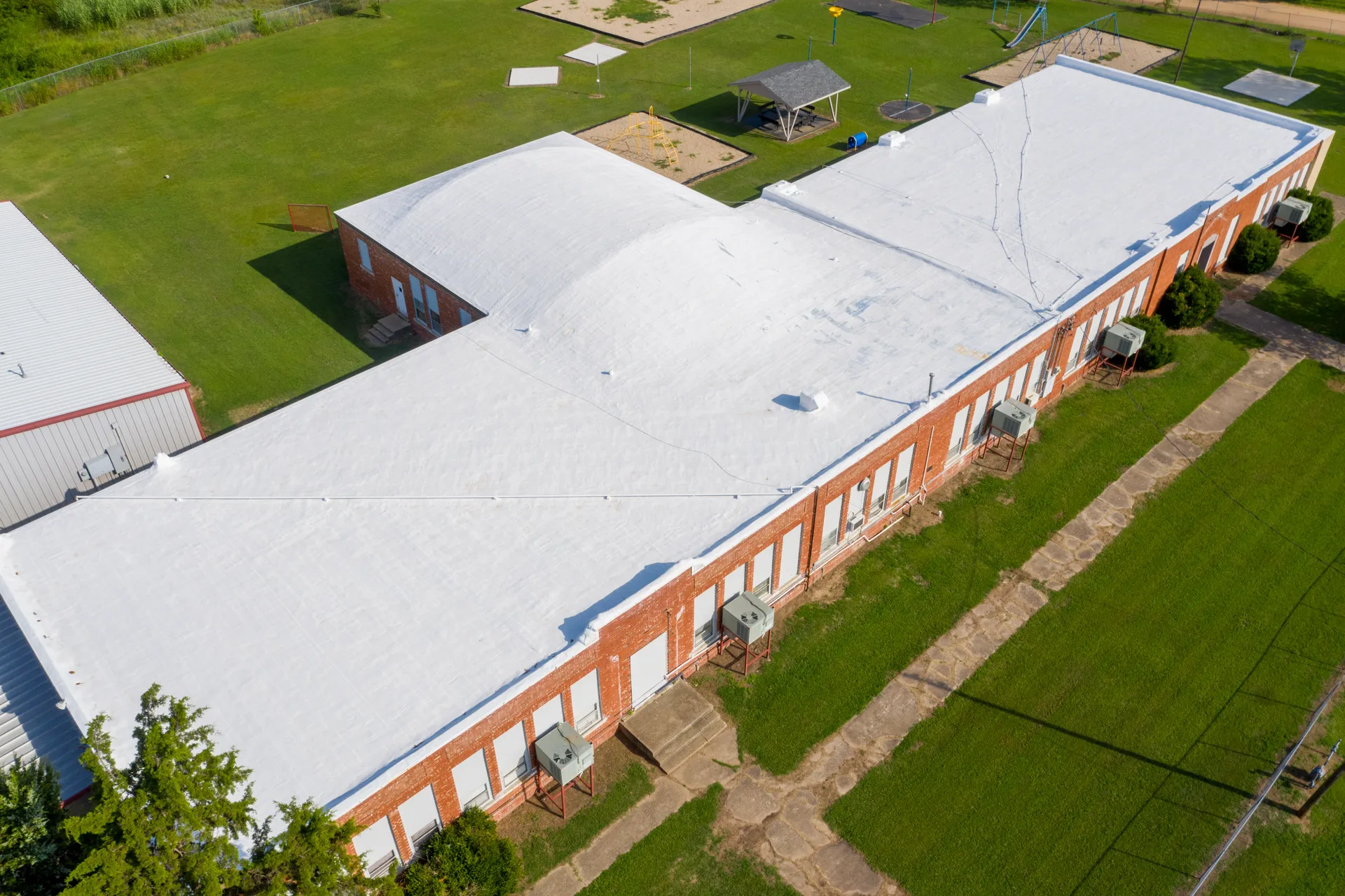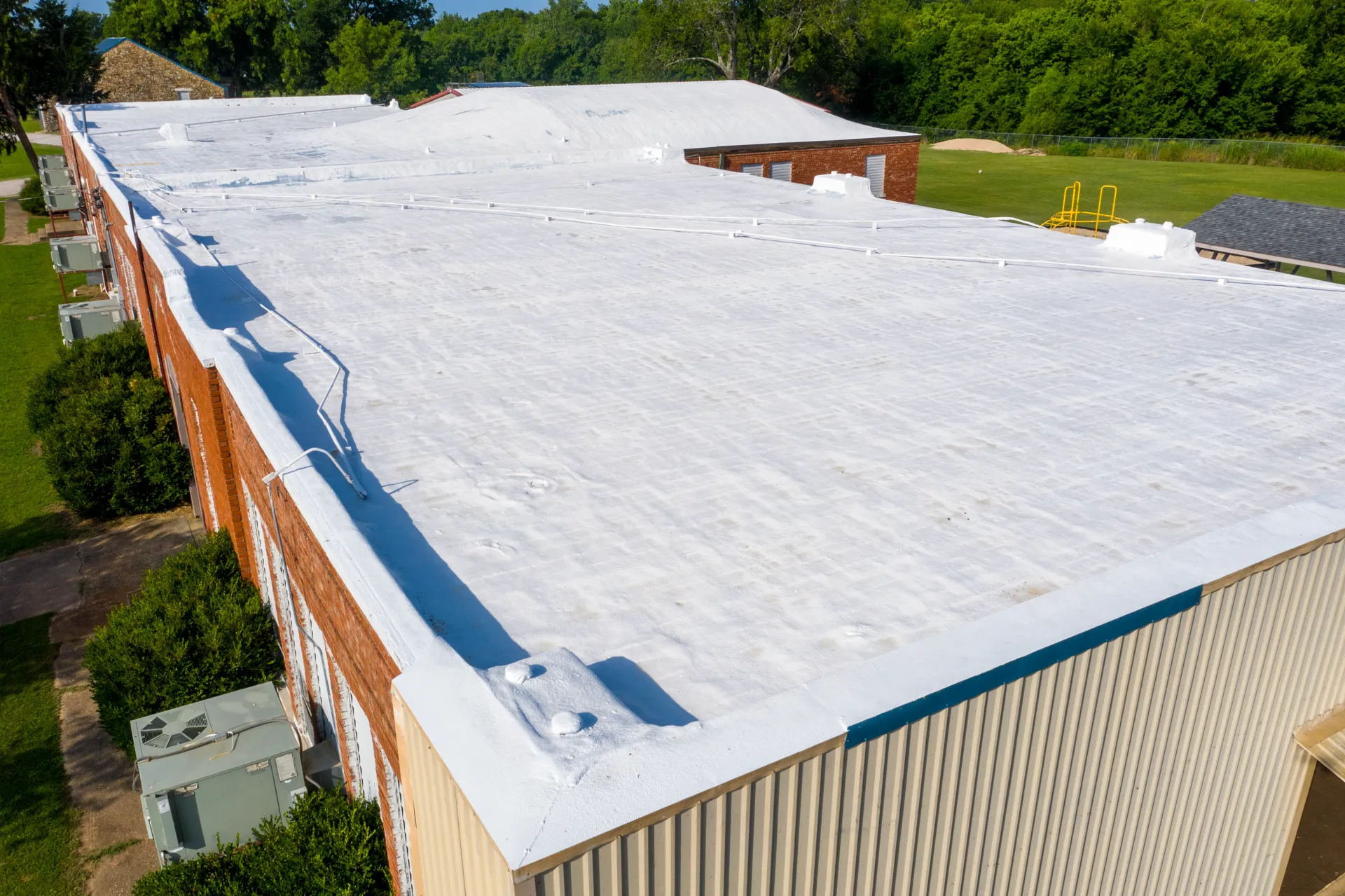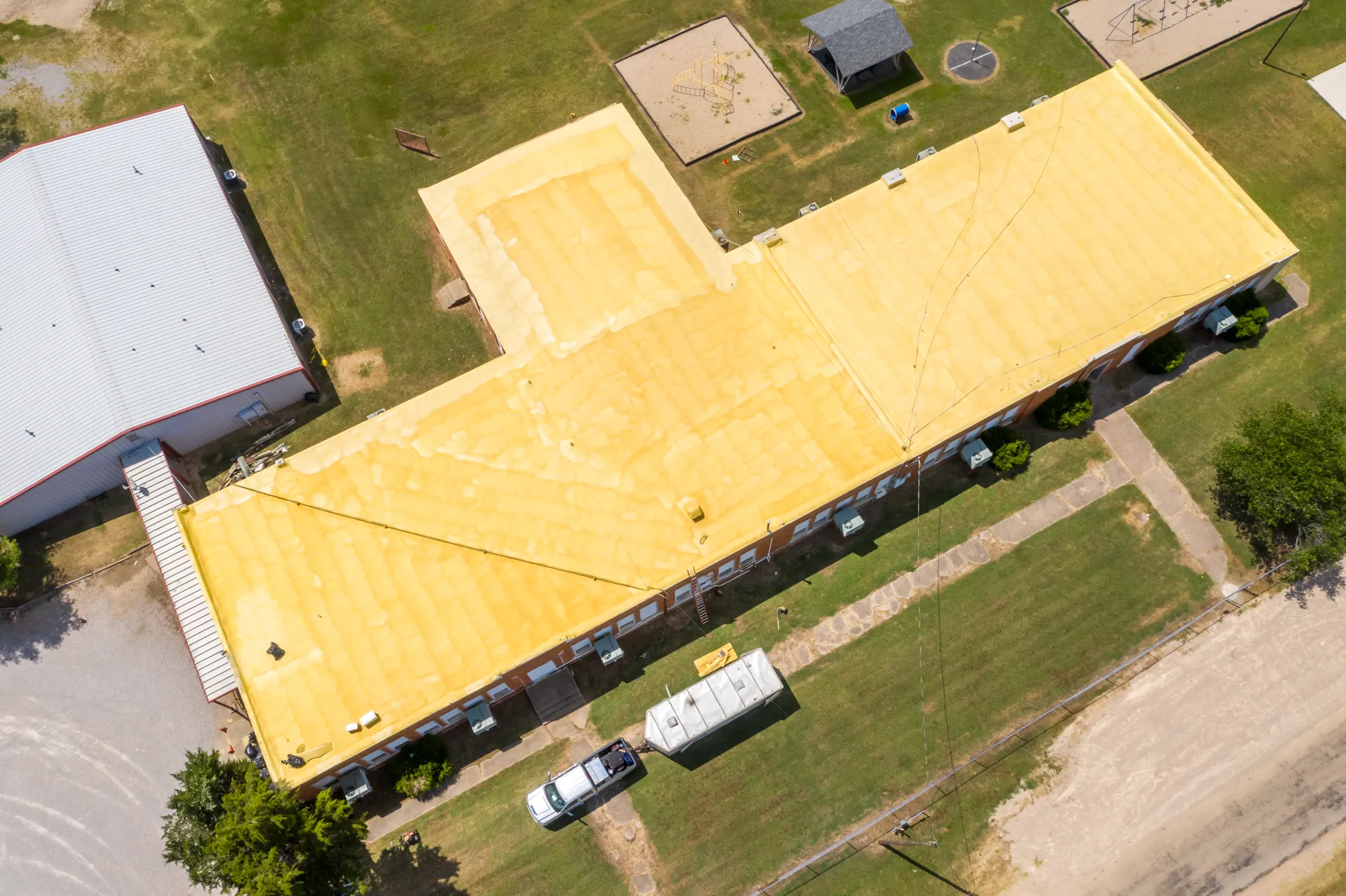 The old foam roof of this school was shaved down to provide a consistent and smooth surface. Moisture meters were then used to test for any water present in the old foam system. After confirming that the base layer was smooth and free of moisture the new roof was applied. The new foam roof added thickness to increase the energy efficiency of the building. A hail impact resistant coating was also added to give the building enhanced protection.