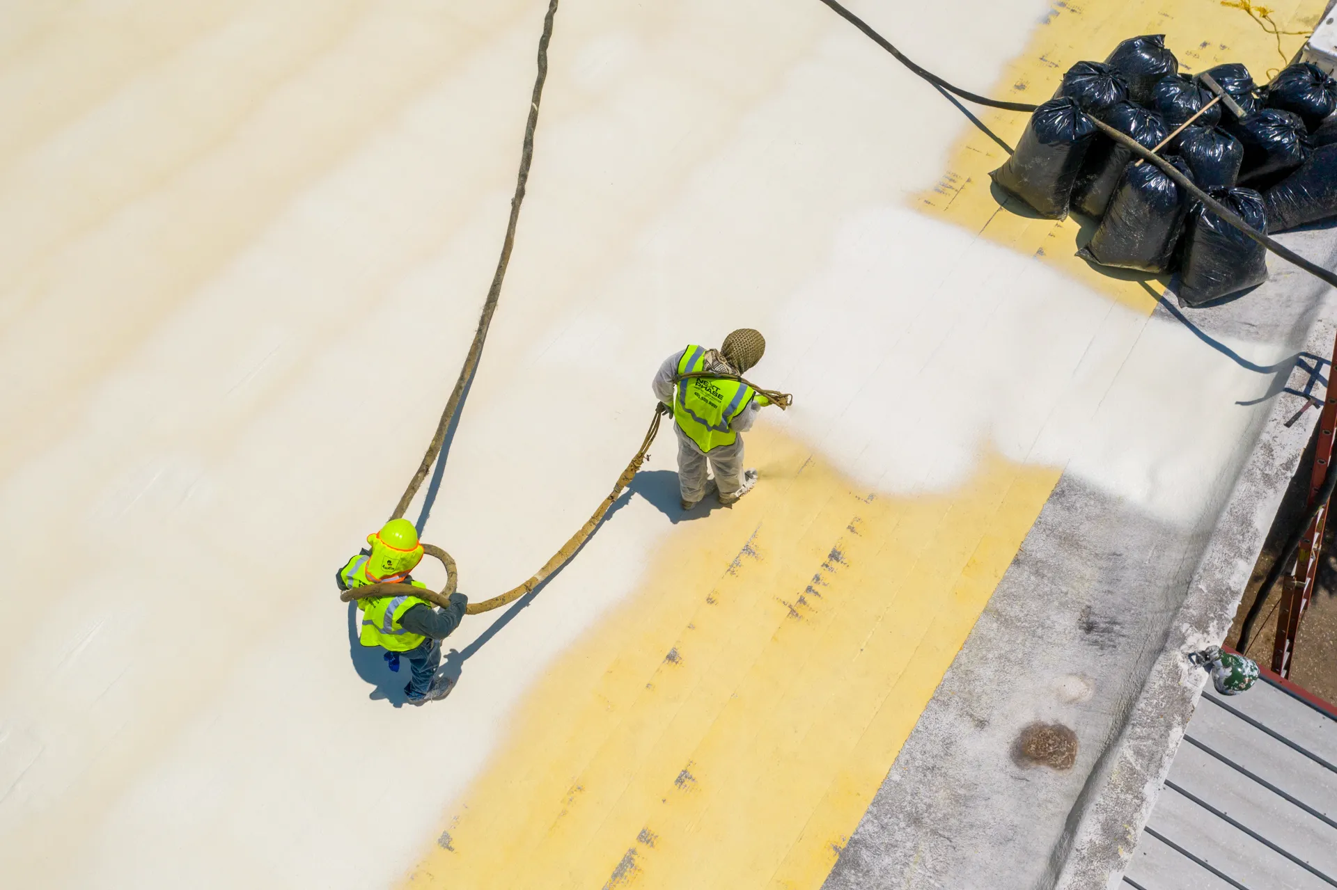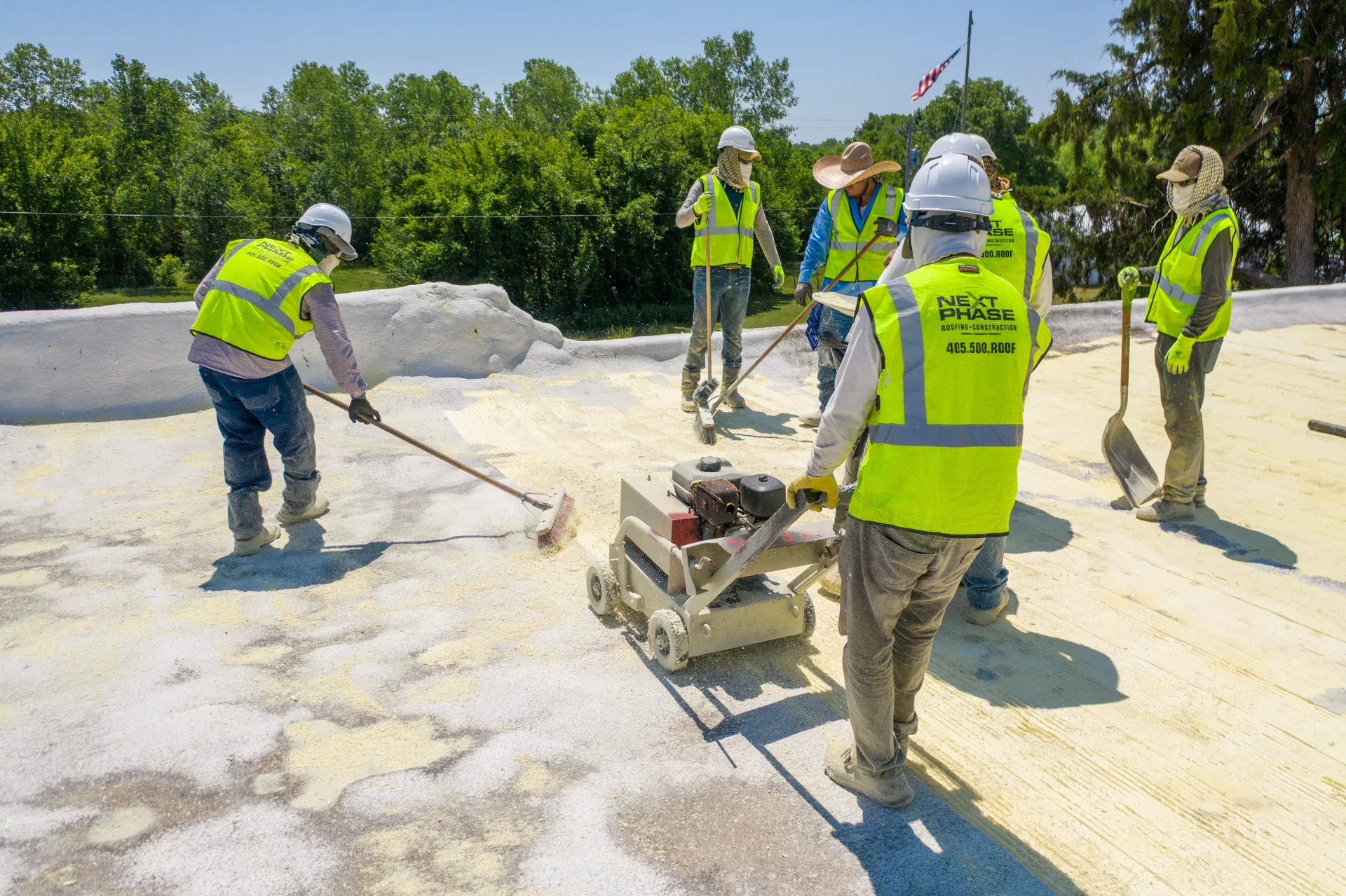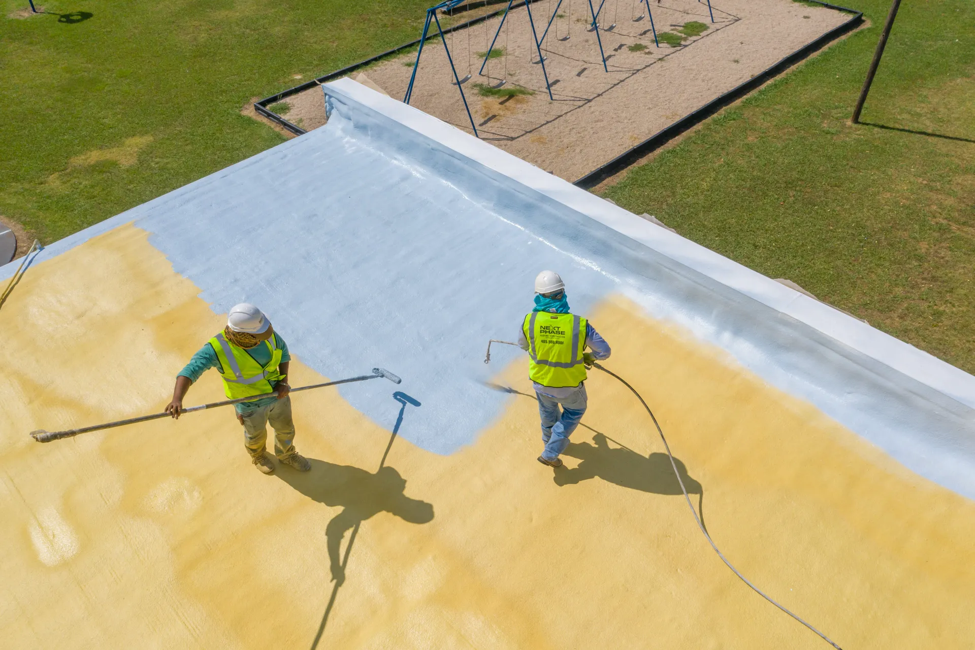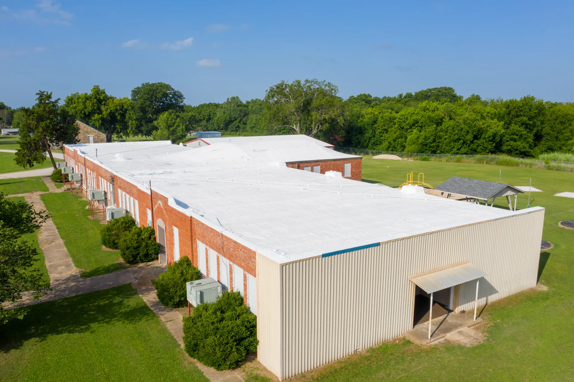 The old foam roof of this school was shaved down to provide a consistent and smooth surface. Moisture meters were then used to test for any water present in the old foam system. After confirming that the base layer was smooth and free of moisture the new roof was applied. The new foam roof added thickness to increase the energy efficiency of the building. A hail impact resistant coating was also added to give the building enhanced protection.